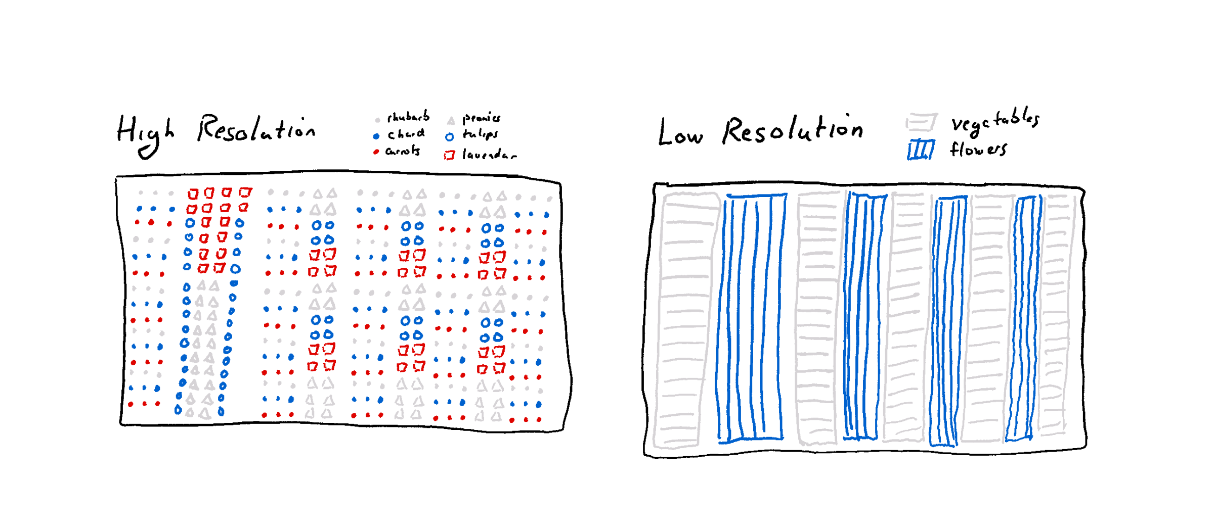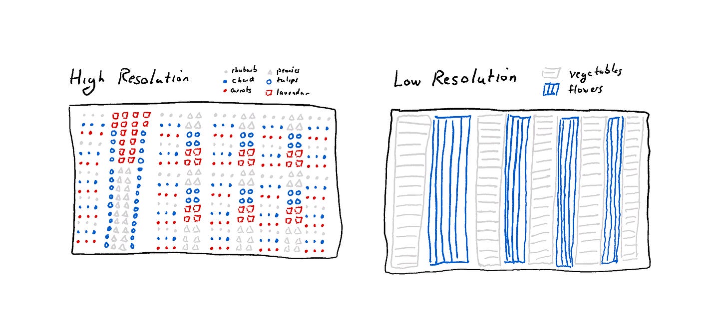 Low resolutions solutions sketch out coarse grained elements usually covering a larger portion of the scope. For the garden this could be understanding which sections are given over to vegetables or flowers.